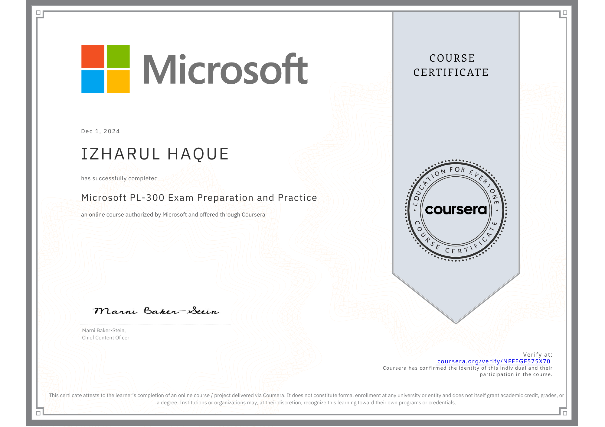 This page showcases my Microsoft and Coursera certifications focused on data analytics, business intelligence, and real-world problem solving. These credentials validate my hands-on skills with enterprise tools and industry best practices.